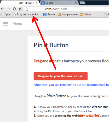 Drag the above Pin it Button to your Bookmarks bar (you can edit the button name later)- Display your Bookmarks bar by clicking the Wrench Icon > Tools > Always Show Bookmarks Bar